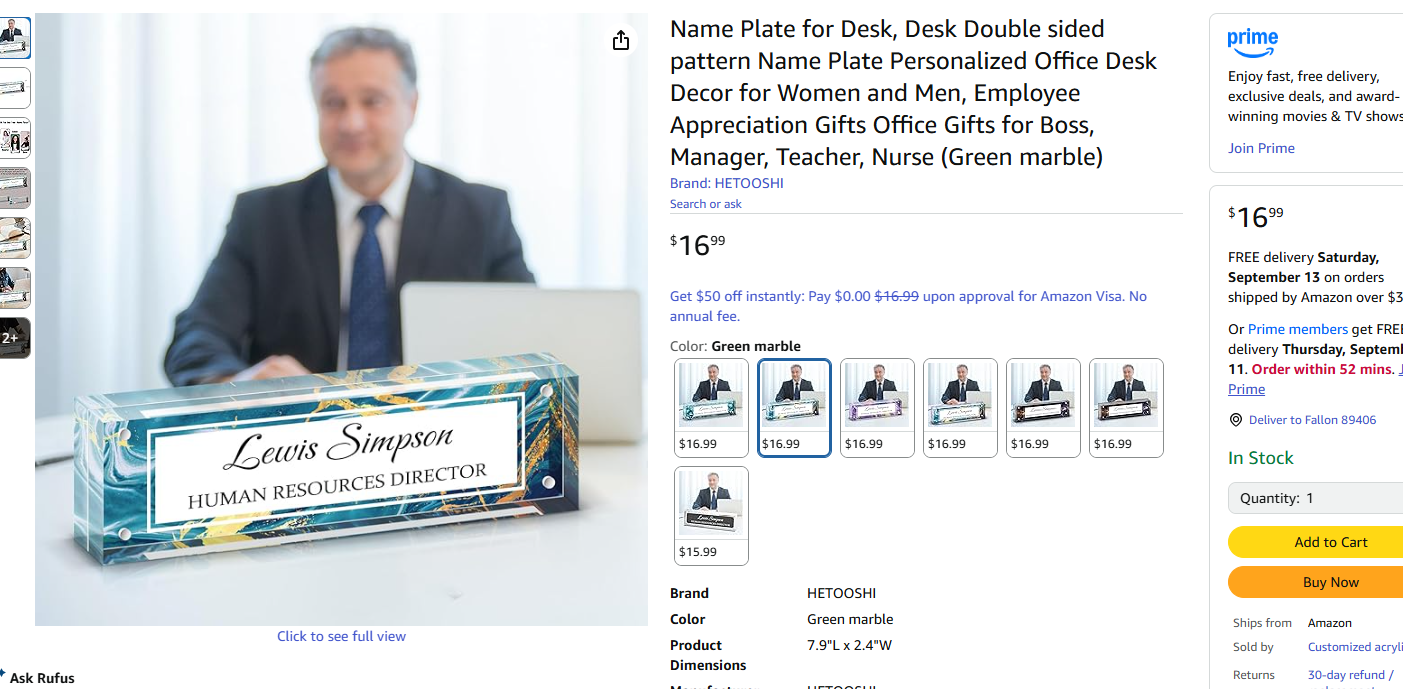 | H25 | NO REVIEW USA | 2 | 10 | 150 | Name Plate for Desk | N/A | 2890 |