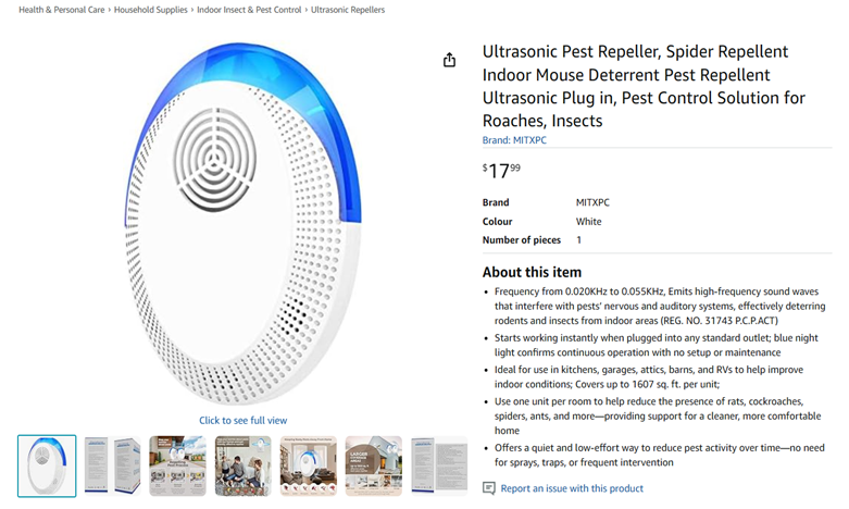 | R12 | CA | 2 | 10 | 700 | https://www.amazon.ca/Ultrasonic-Repeller-Repellent-Deterrent-Solution/dp/B0FK59HMS8 | N/A | 2171 |
